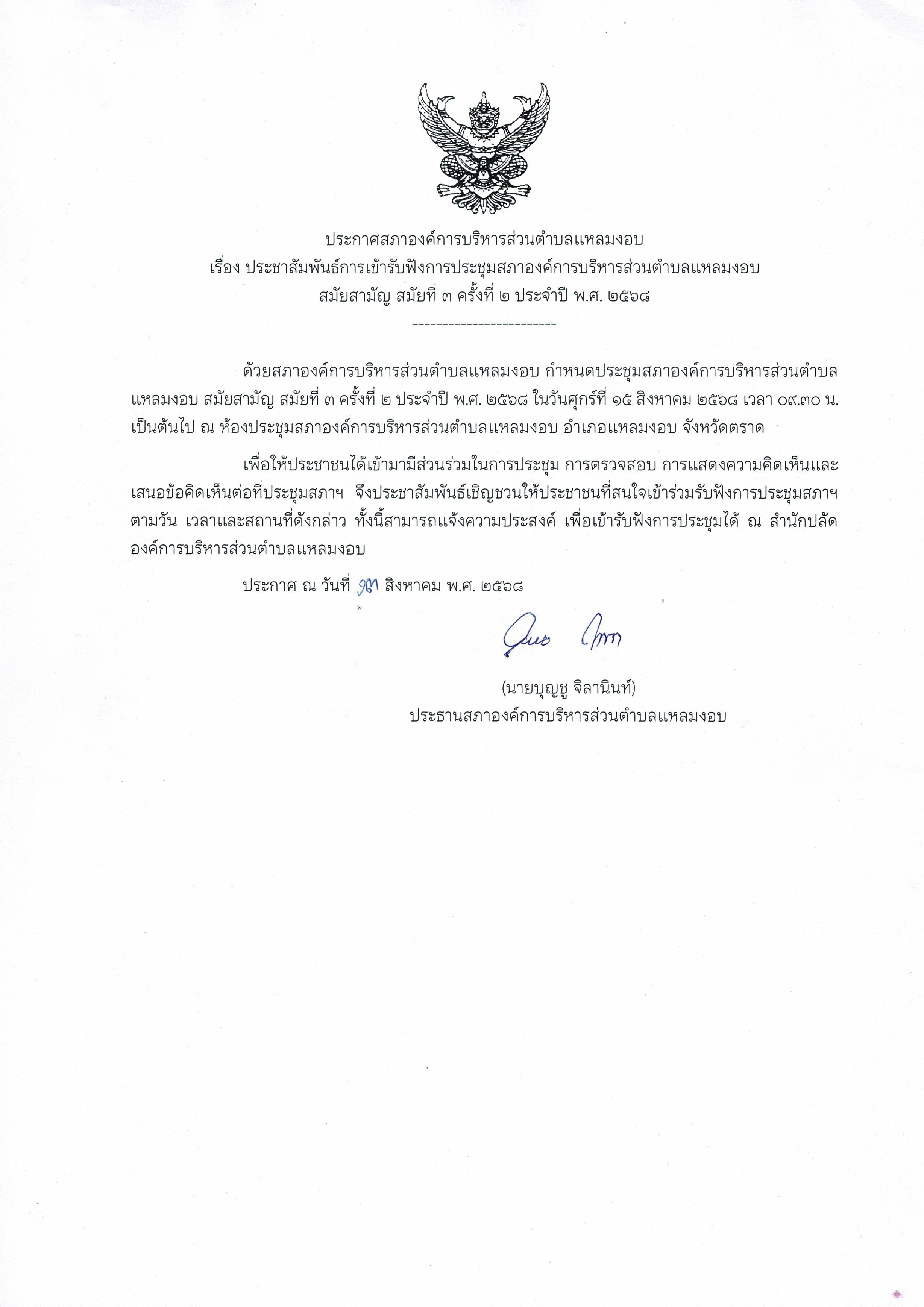 ประกาศองค์การบริหารส่วนตำบลแหลมงอบ เรื่อง ประชาสัมพันธ์การเข้ารับฟังการประชุมสภาองค์การบริหารส่วนตำบลแหลมงอบ สมัยสามัญ สมัยที่ 3 ครั้งที่ 2 ประจำปี พ.ศ. 2568