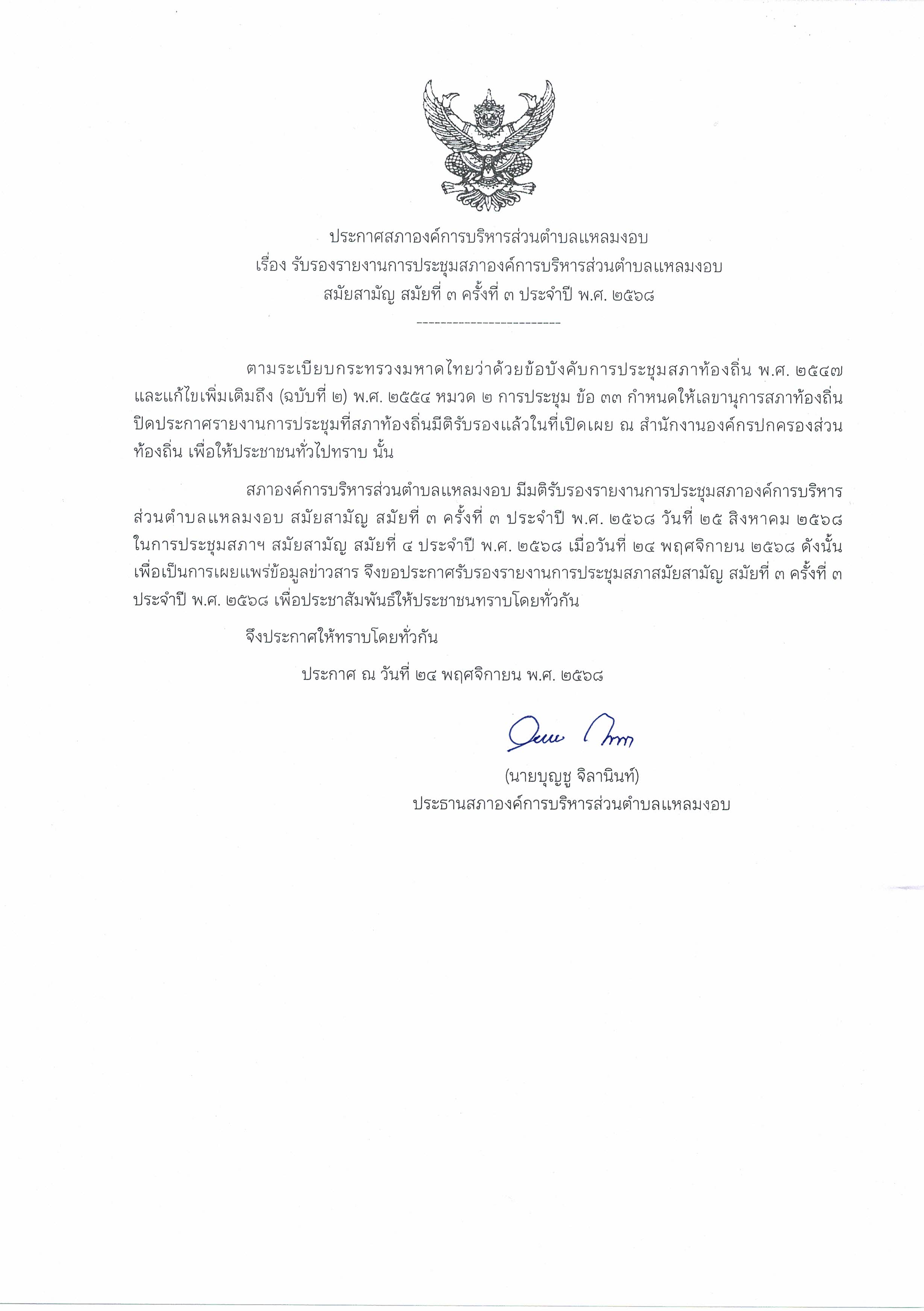 ประกาศองค์การบริหารส่วนตำบลแหลมงอบ เรื่อง รับรองรายงานการประชุมสภาองค์การบริหารส่วนตำบลแหลมงอบ สมัยสามัญ สมัยที่ 3 ครั้งที่ 3 ประจำปี พ.ศ.2568