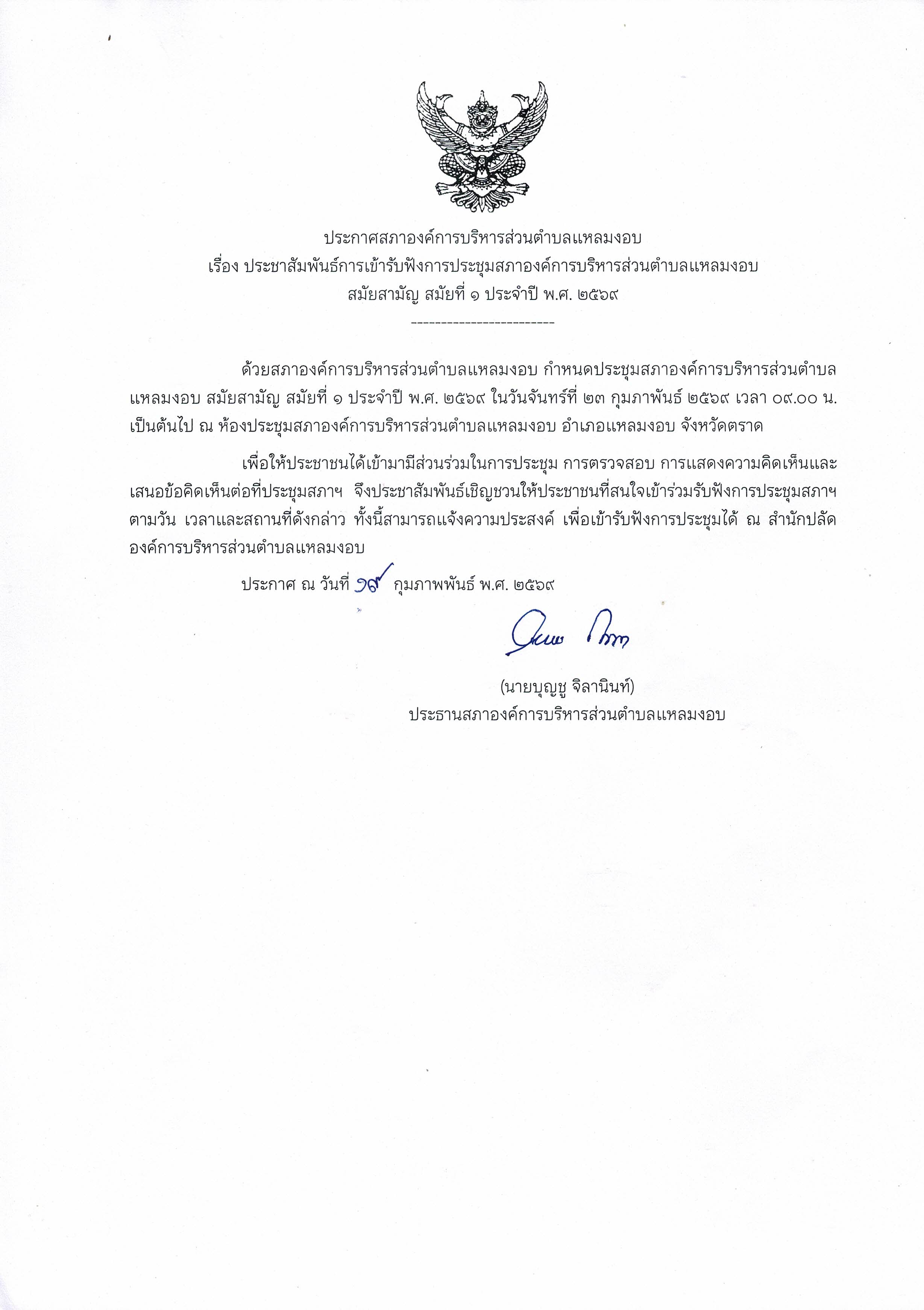 ประกาศสภาองค์การบริหารส่วนตำบลแหลมงอบ เรื่อง ประชาสัมพันธ์การเข้ารับฟังการประชุมสภาองค์การบริหารส่วนตำบลแหลมงอบ สมัยสามัญ สมัยที่ 1 ประจำปี พ.ศ. 2566 03/02/2566