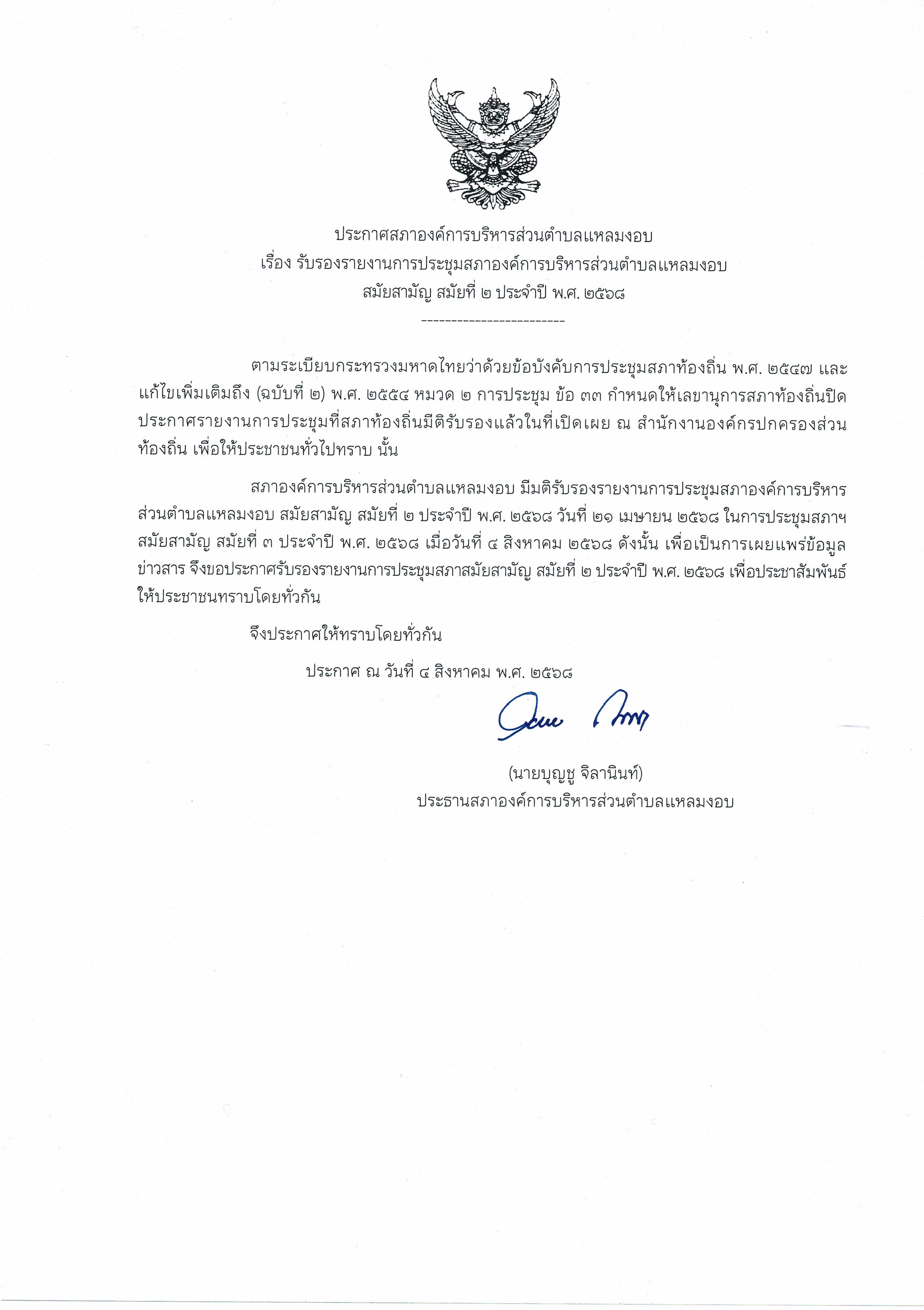 ประกาศสภาองค์การบริหารส่วนตำบลแหลมงอบ เรื่อง รับรองรายงานการประชุมสภาองค์การบริหารส่วนตำบลแหลมงอบ สมัยสามัญ สมัยที่ 2 ประจำปี พ.ส.2568