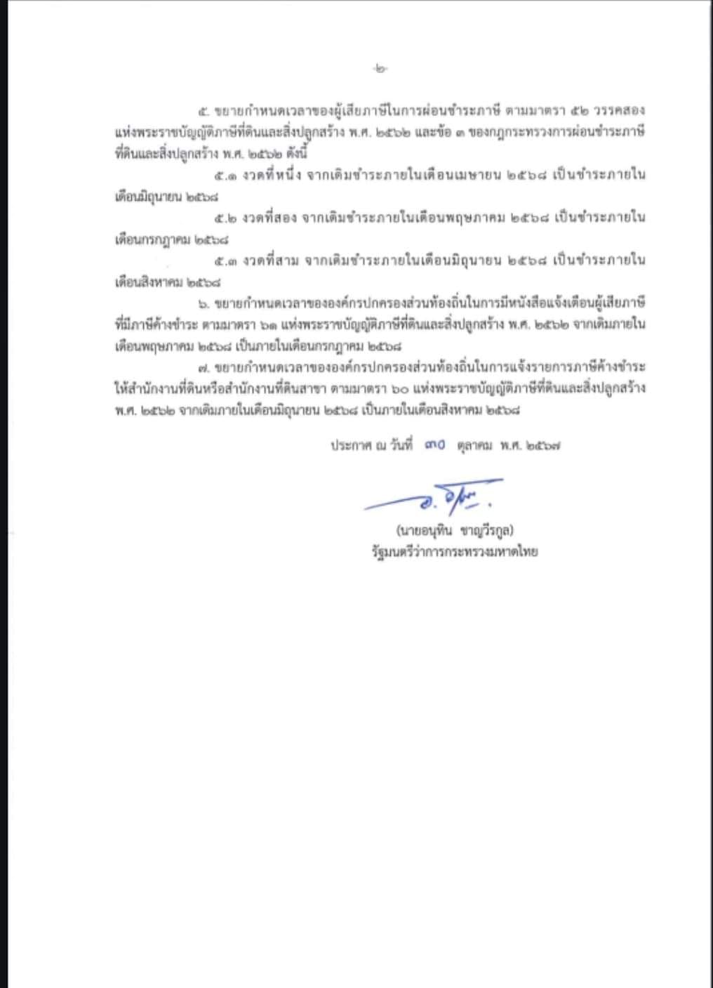 ประชาสัมพันธ์ ประกาศกระทรวงมหาดไทย เรื่อง การขยายกำหนดเวลาดำเนินการตามพระราชบัญญัติภาษีที่ดินและสิ่งปลูกสร้าง พ.ศ. 2562 ประจำปี พ.ศ. 2568