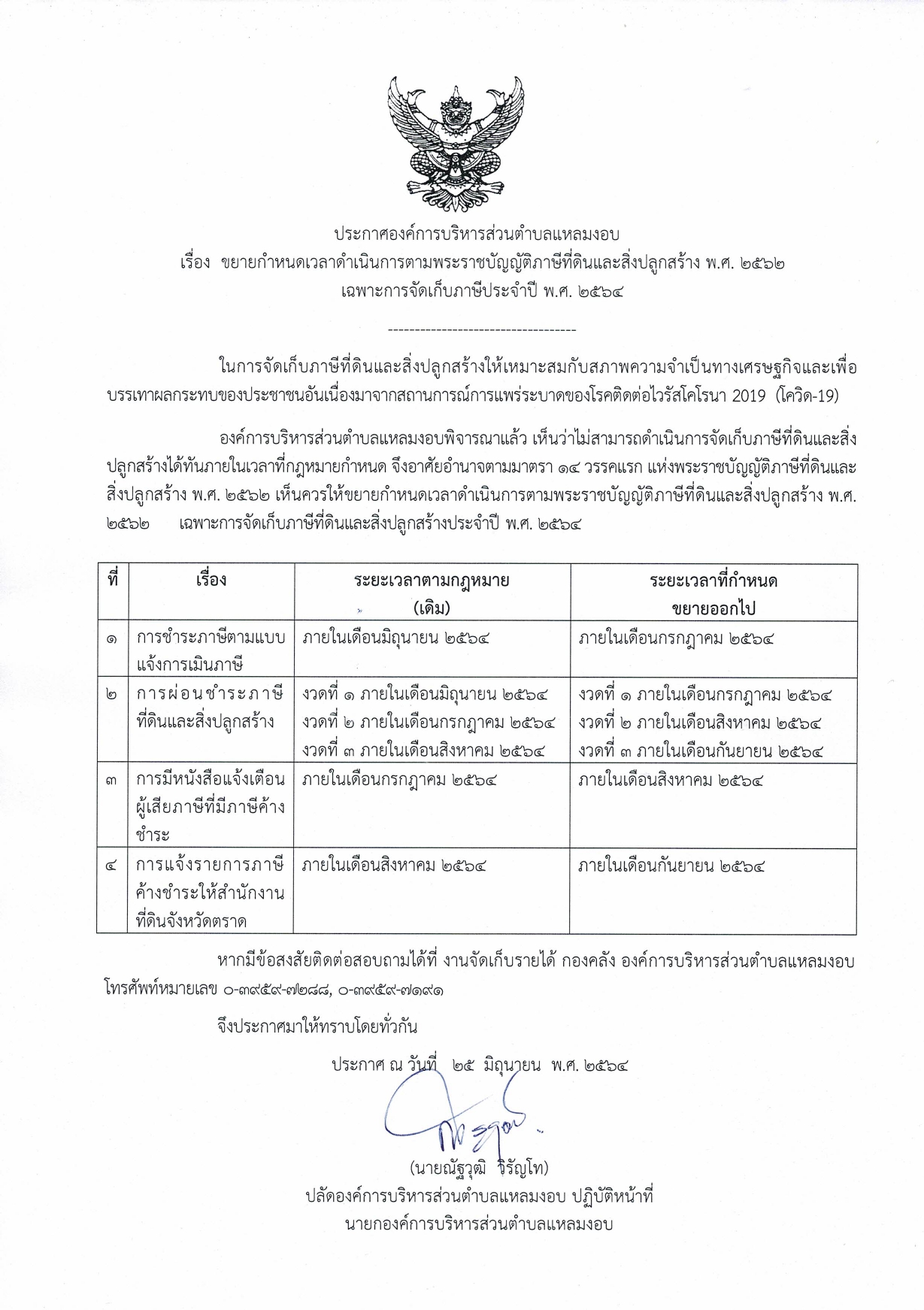 ประกาศองค์การบริหารส่วนตำบลแหลมงอบ เรื่อง ขยายกำหนดเวลาดำเนินการตามพระราชบัญญัติภาษีที่ดินและสิ่งปลูกสร้าง พ.ศ. 2562 เฉพาะการจัดเก็บภาษีประจำปี พ.ศ. 2564