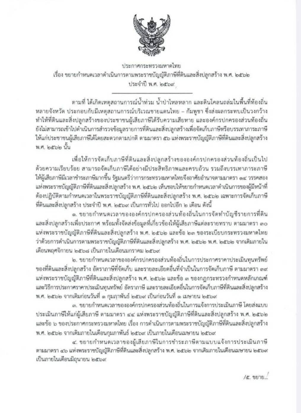 ขยายกำหนดเวลาดำเนินการตามพระราชบัญญัติภาษีที่ดินและสิ่งปลูกสร้าง พ.ศ. 2562
