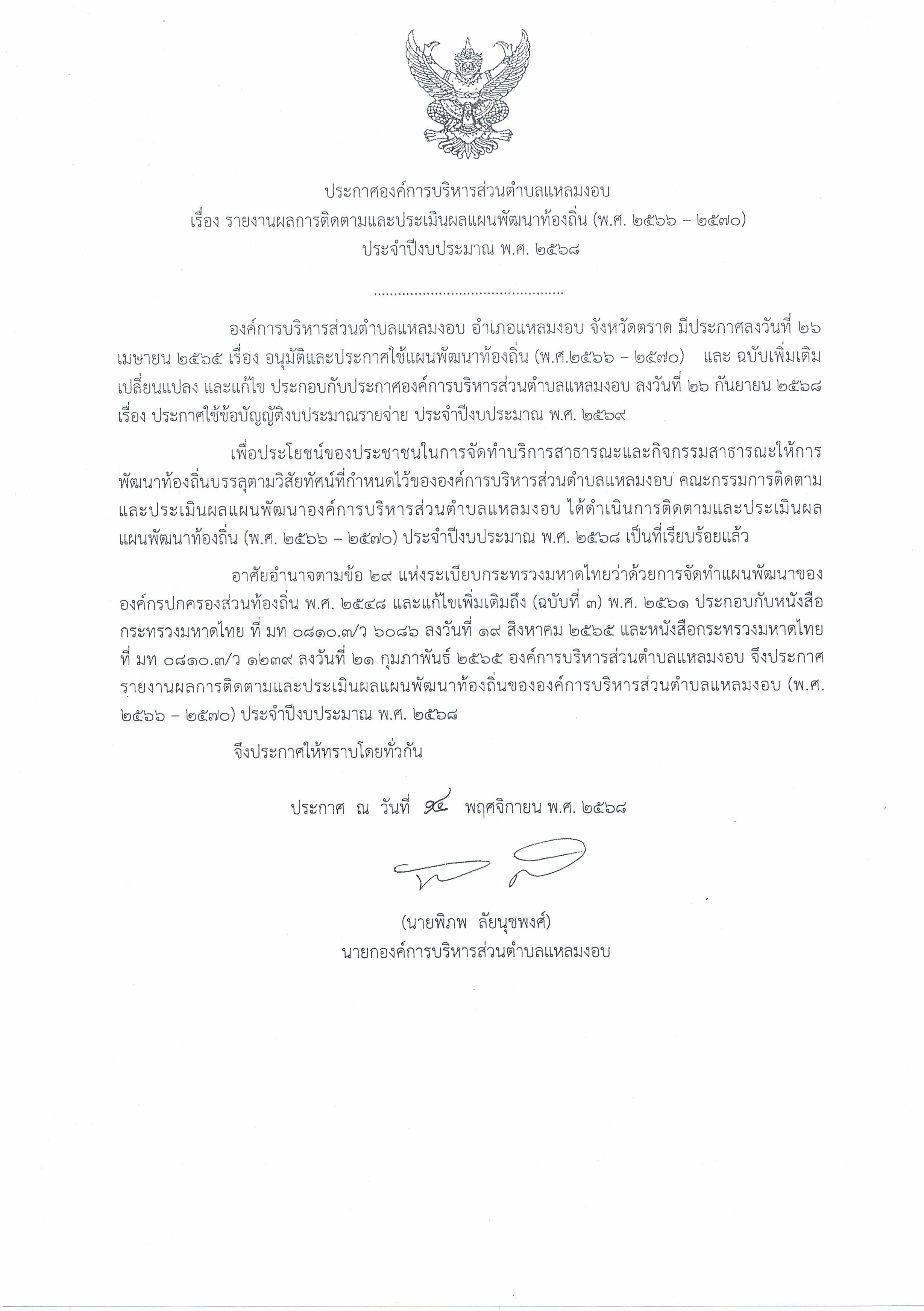 ประกาศองค์การบริหารส่วนตำบลแหลมงอบ เรื่อง รายงานผลการติดตามและประเมินผลแผนพัฒนาท้องถิ่น พ.ศ.2568